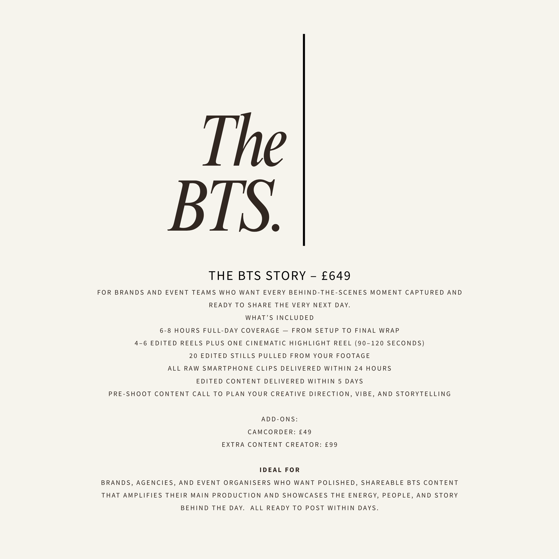 Brands, agencies, and event organisers who want polished, shareable BTS content that amplifies their main production and showcases the energy, people, and story behind the day.all ready to post within days.